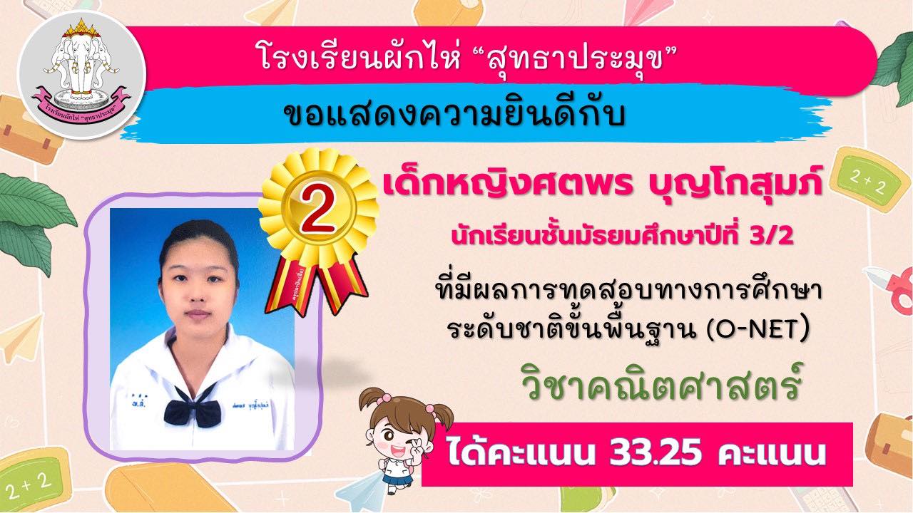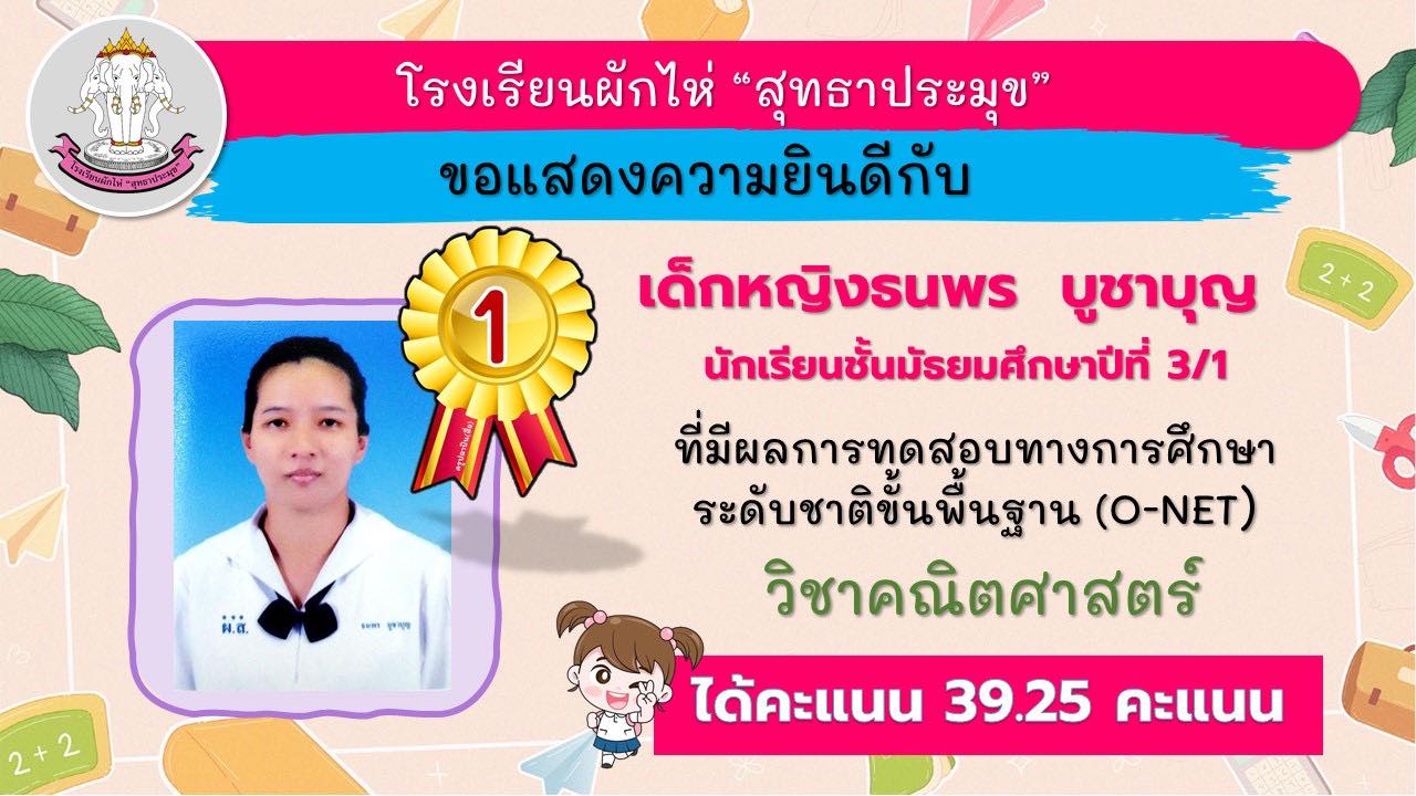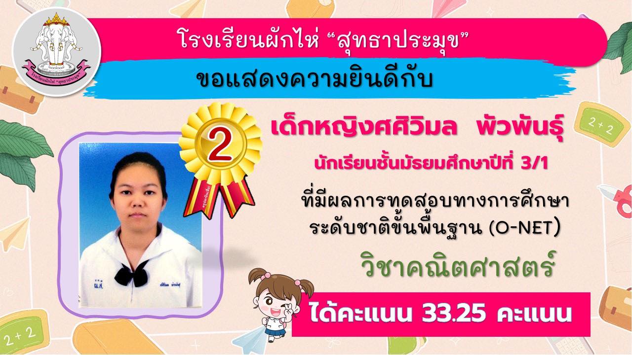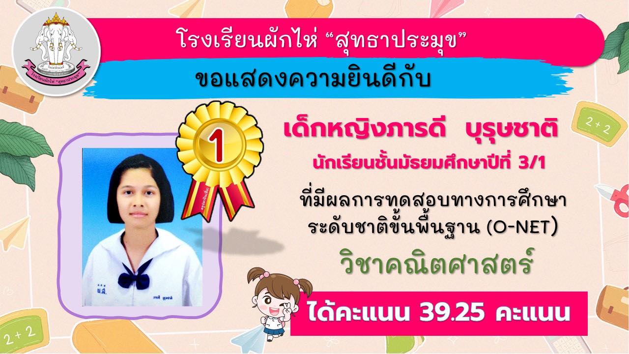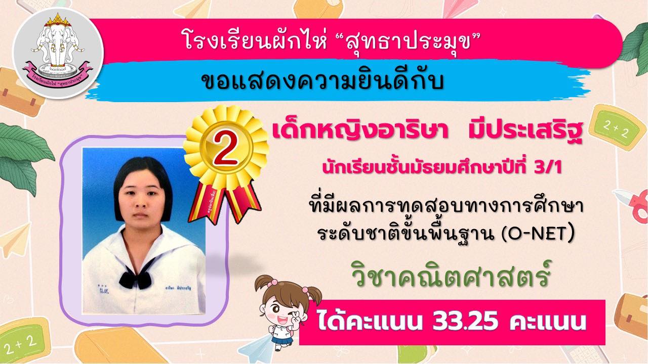 มีผลการทดสอบคะแนน O-NET ปีการศึกษา 2564 ชั้นม.3 เป็นอับ 2 ของโรงเรียนผักไห่ "สุทธาประมุข" รายวิชาคณิตศาสตร์