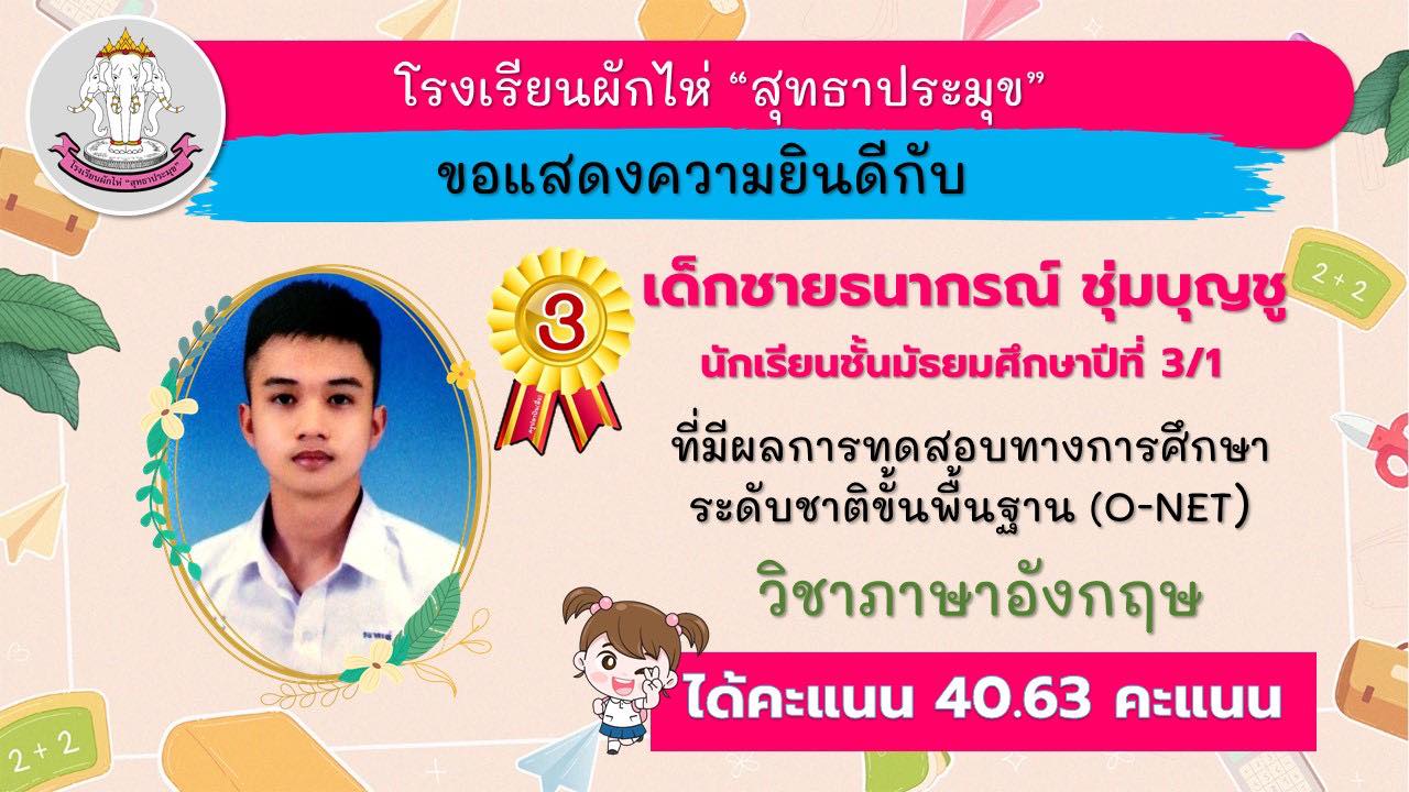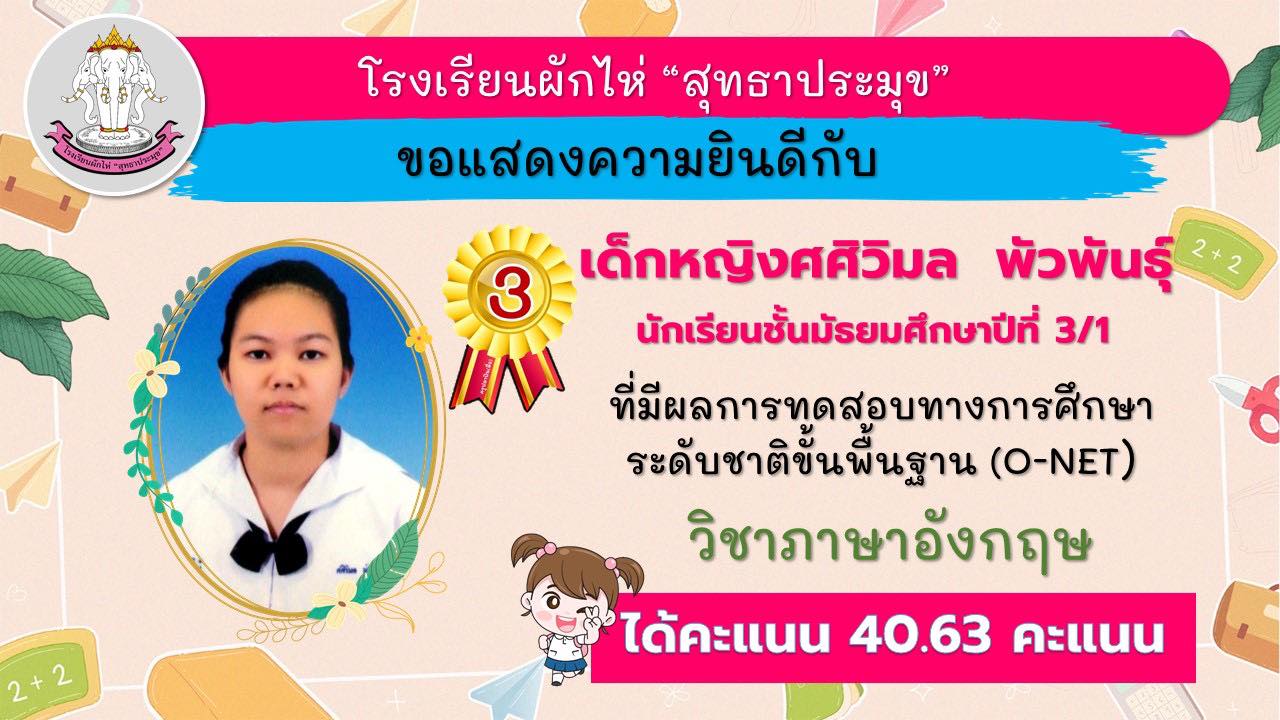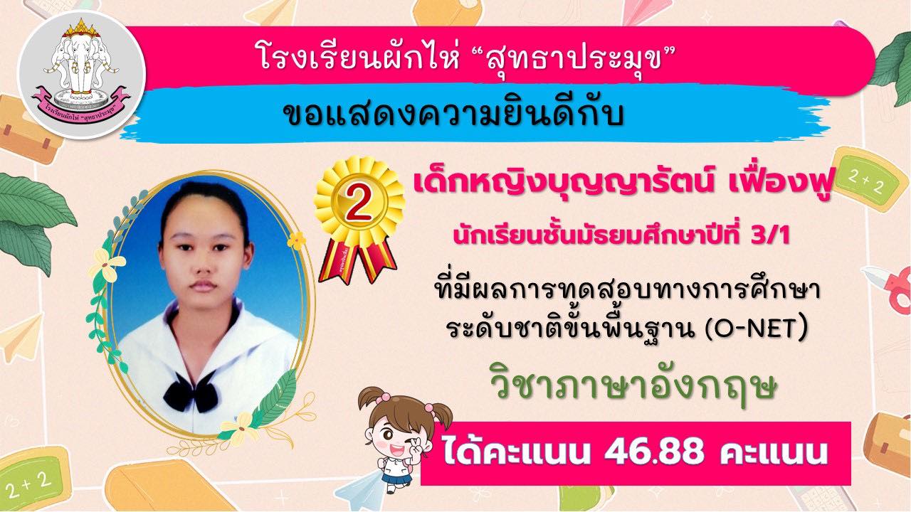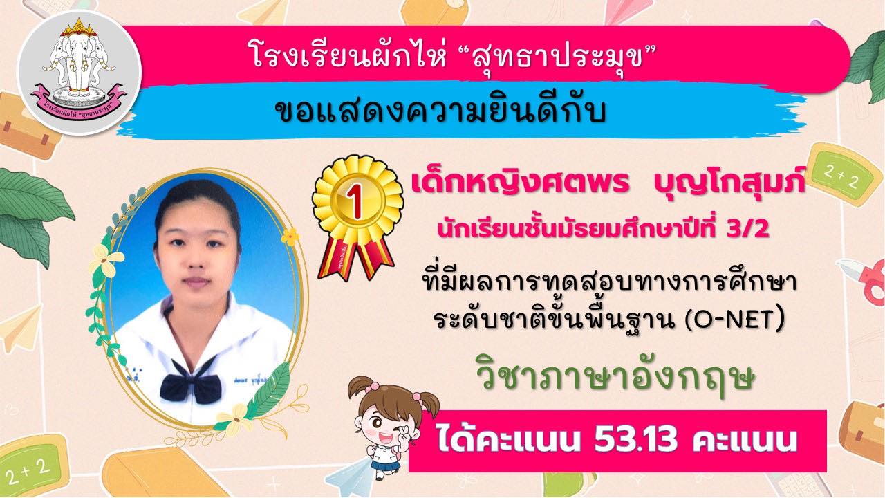 มีผลการทดสอบคะแนน O-NET ปีการศึกษา 2564 ชั้นม.3 เป็นอับ 1 ของโรงเรียนผักไห่ "สุทธาประมุข" รายวิชา ภาษาอังกฤษ